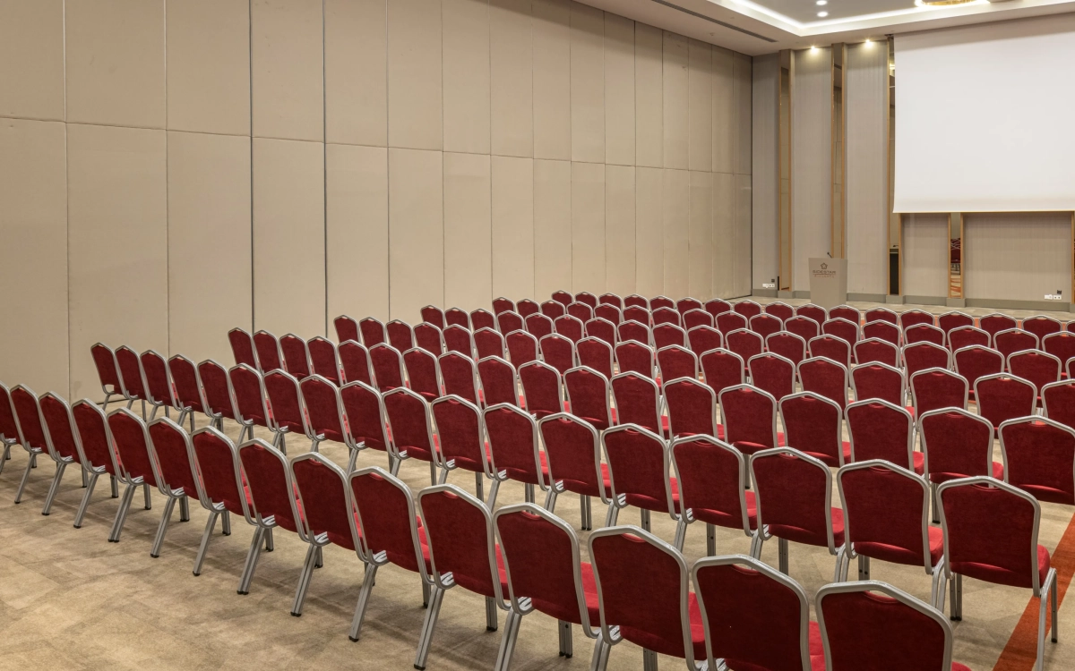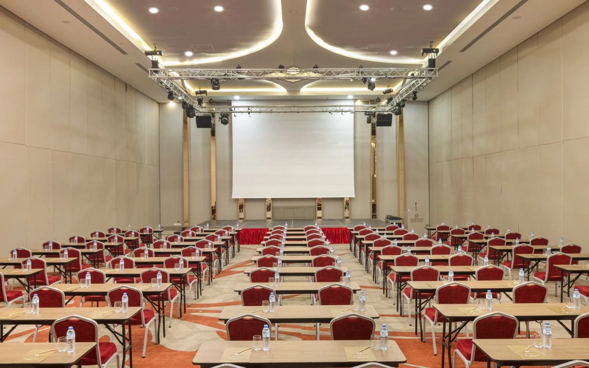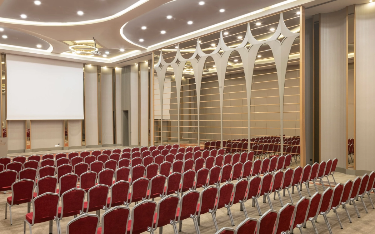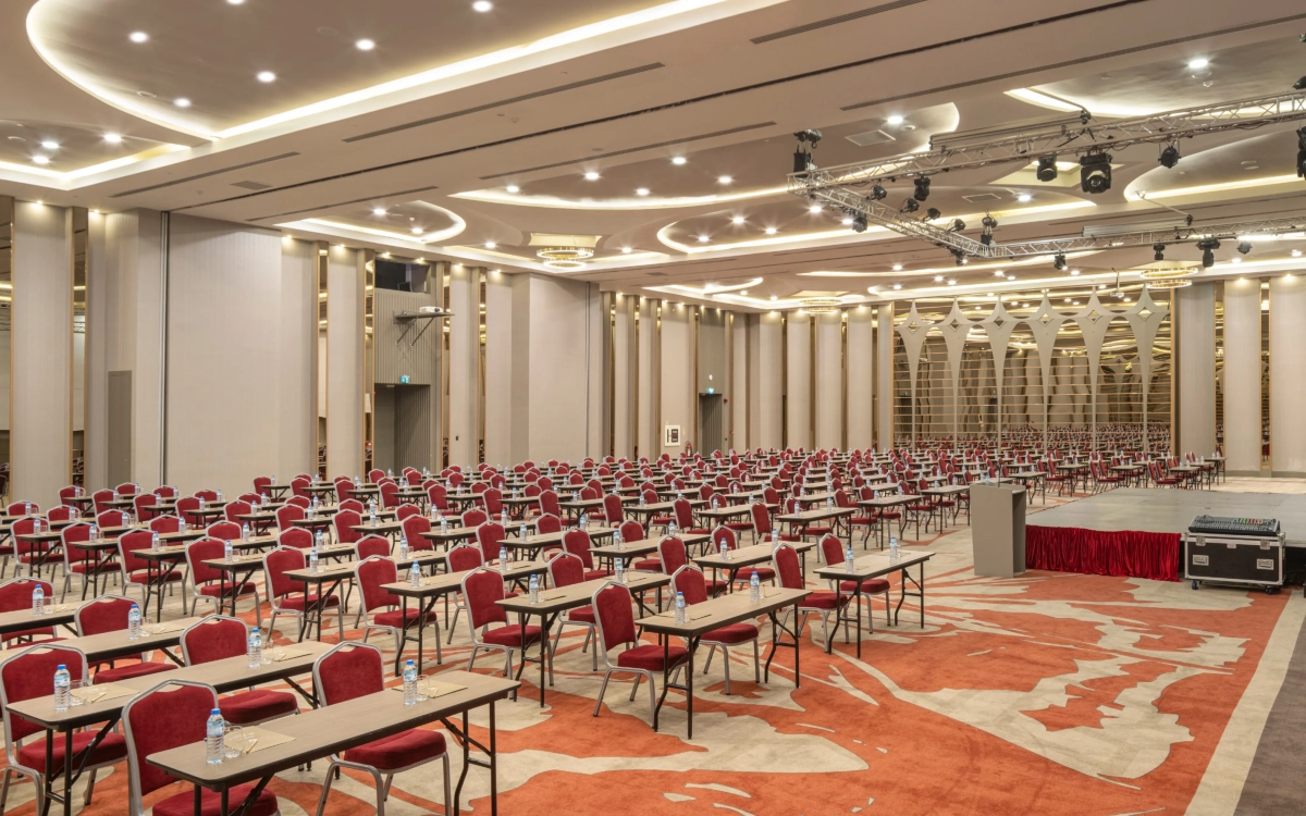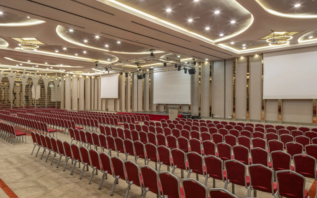 6,90m yükseklikte 910 m2 alana kurulmuş, kolonsuz, üçe bölünüp 3 ayrı salon olabilen, profesyonel ses yalıtımına sahip, tüm profesyonel ses ışık ve görüntü sistemleriyle donatılmış salonumuzdur.