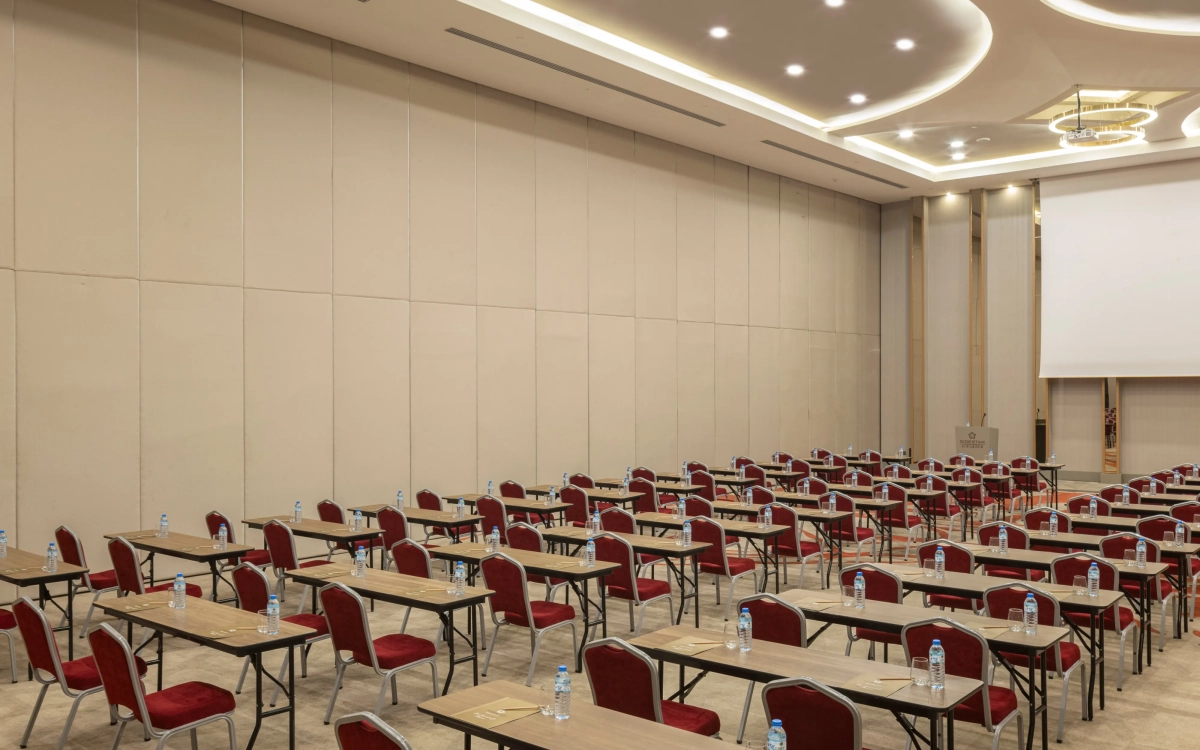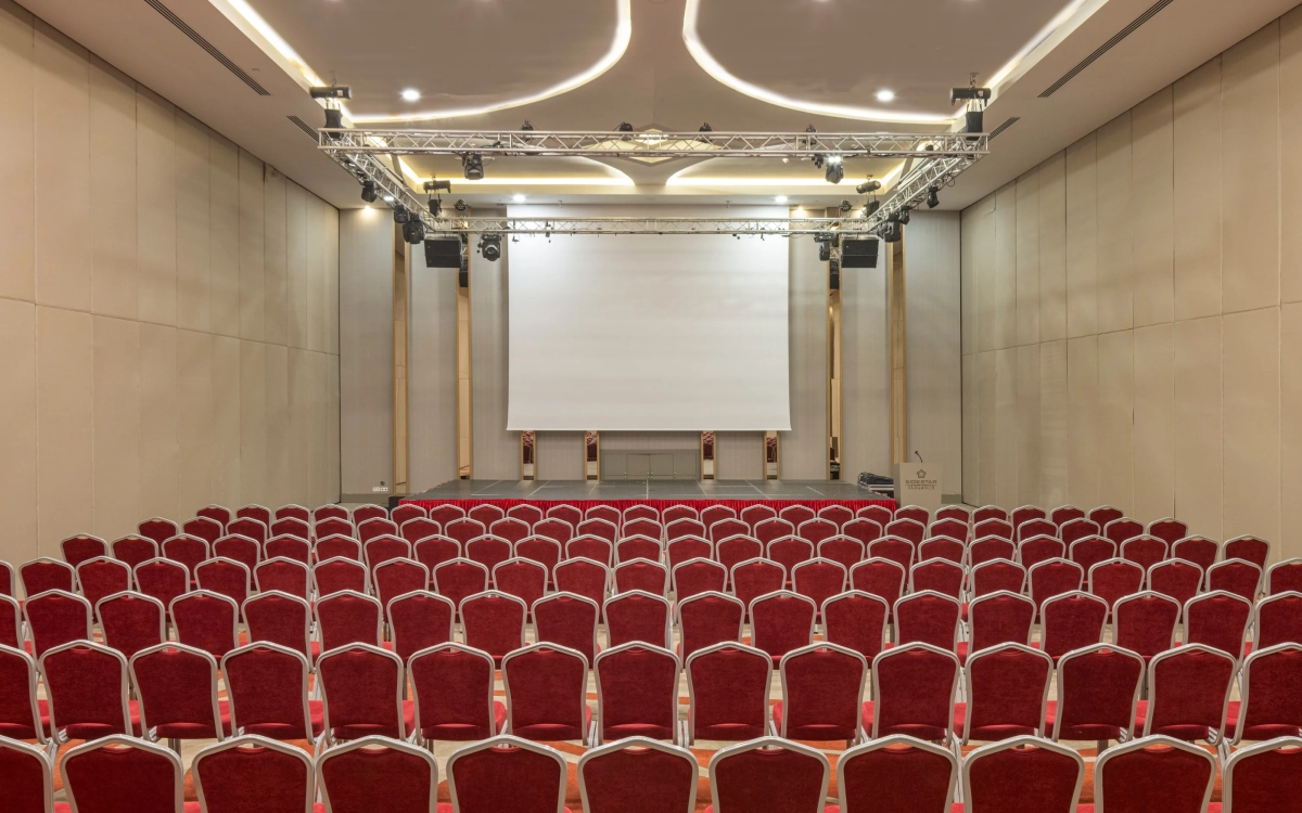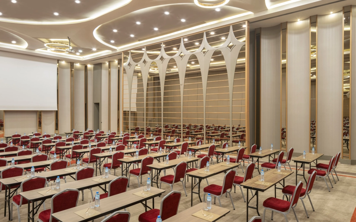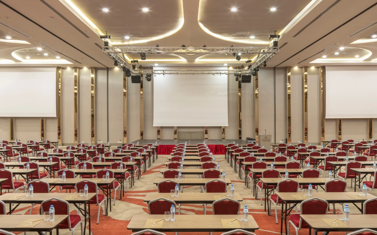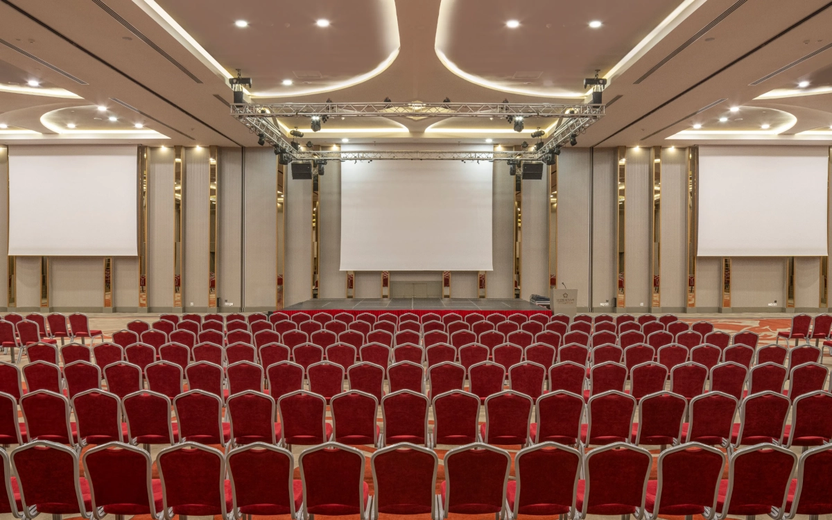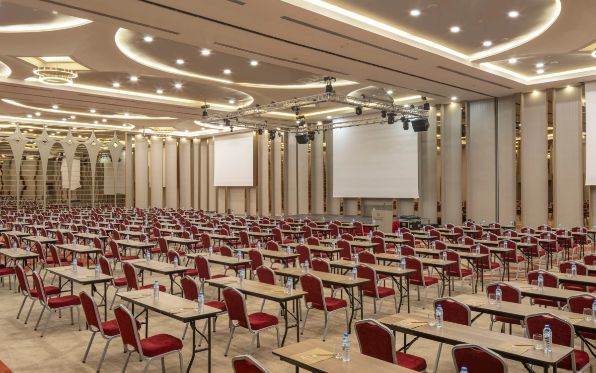 6,90m yükseklikte 910 m2 alana kurulmuş, kolonsuz, üçe bölünüp 3 ayrı salon olabilen, profesyonel ses yalıtımına sahip, tüm profesyonel ses ışık ve görüntü sistemleriyle donatılmış salonumuzdur.